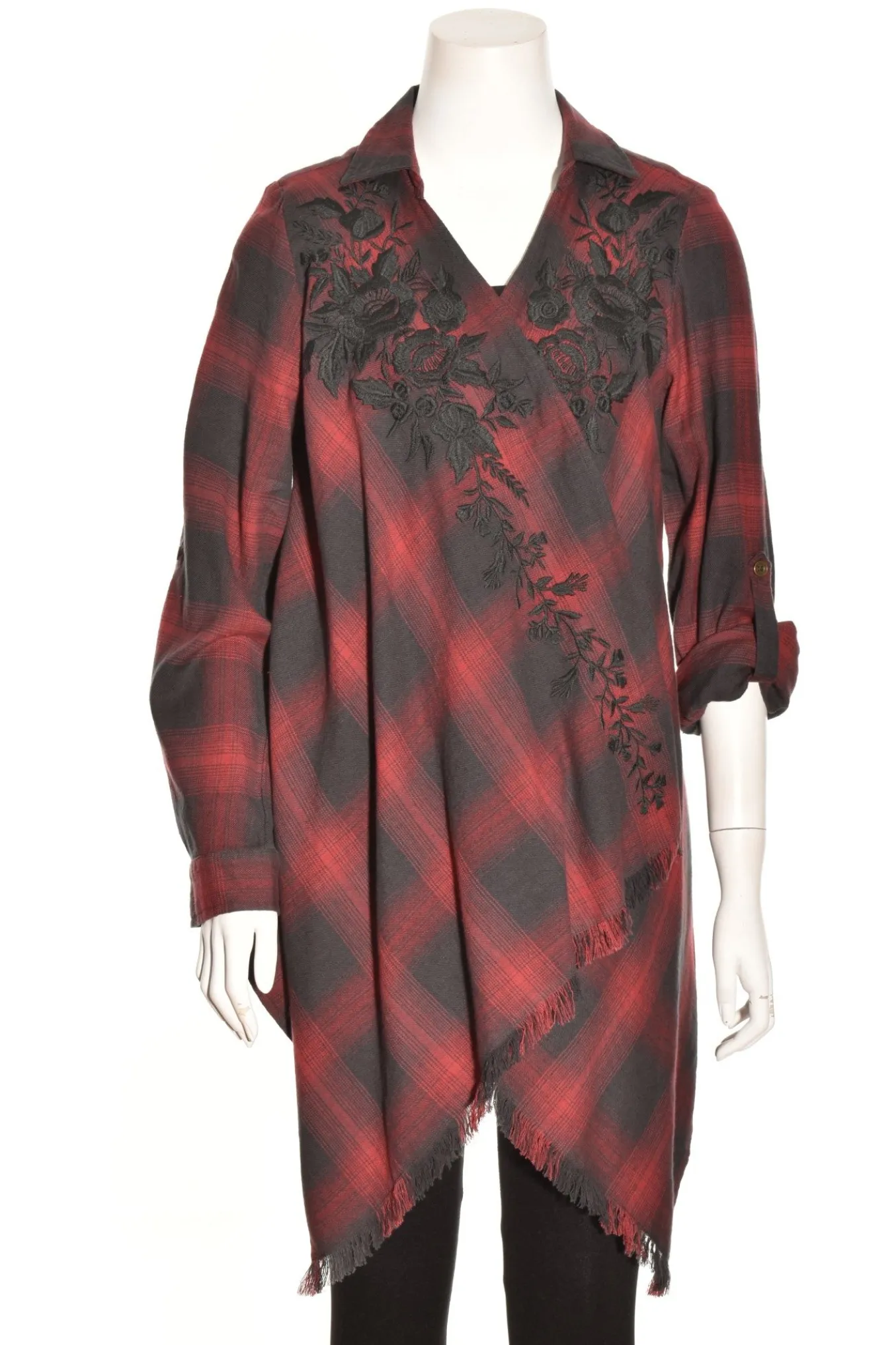 This Open Front Bohemian Chic Jacket In Super Soft Flannel Has A Cool Fringed Hem That Hits Longer On The Sides. In A Subtle Tonal Embroidered Plaid Fabric, Other Details Include A Collared Neckline And Full Length Sleeves With Button Tabs.