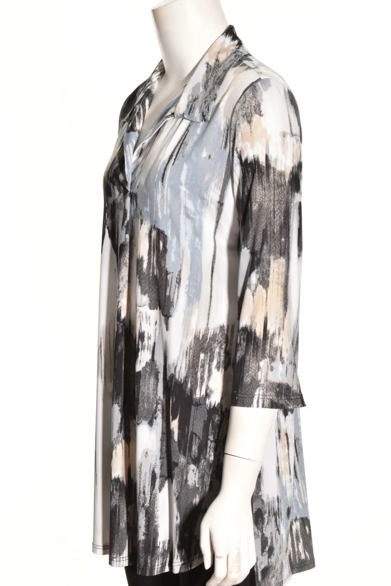Another Travel Friendly Tunic By Caribe, This Pullover Collared Tunic In A Contemporary Brushstroke Design. Details Include An Open V-Neck Pointed Collar, 3/4 Length Sleeves, A Slight A-Line Silhouette With A Subtle High-Lo Hemline That Curves In The Front And Is Straight In The Back.