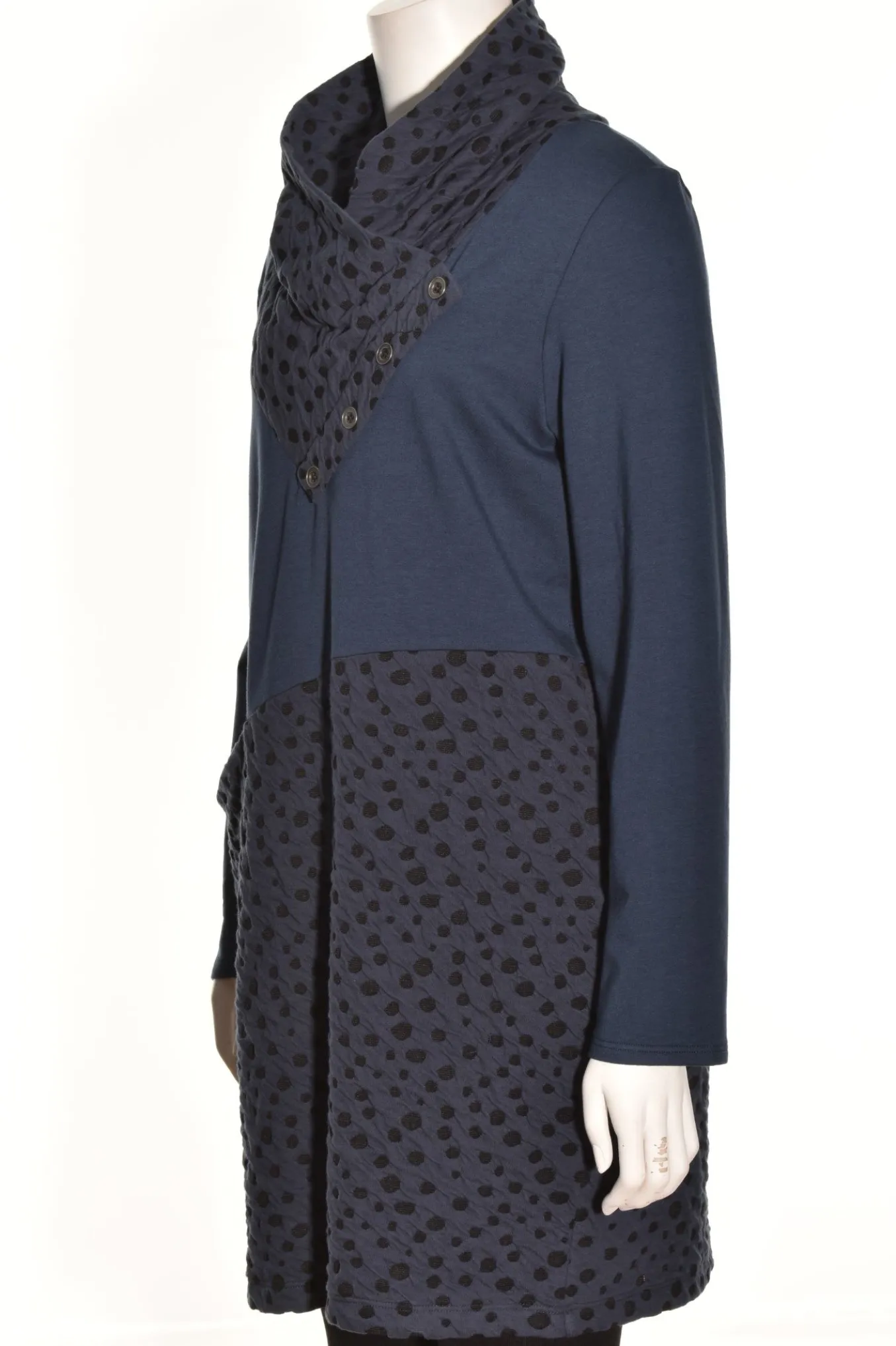 This Fabric Has A Cozy Quilted Texture. The Frances Tunic Has Complimentary Contrasting Mix On Fabrics. The Flattering Neckline With Dots Has Four Metal Buttons Purely For Decorative Appeal. A Curved Seam Separates The Dotted Bottom And Features One Pocket On The Seam. The Length Is Longer And Has Full Length Sleeves For Ultimate Coziness When Jack Frost Comes Knocking.
