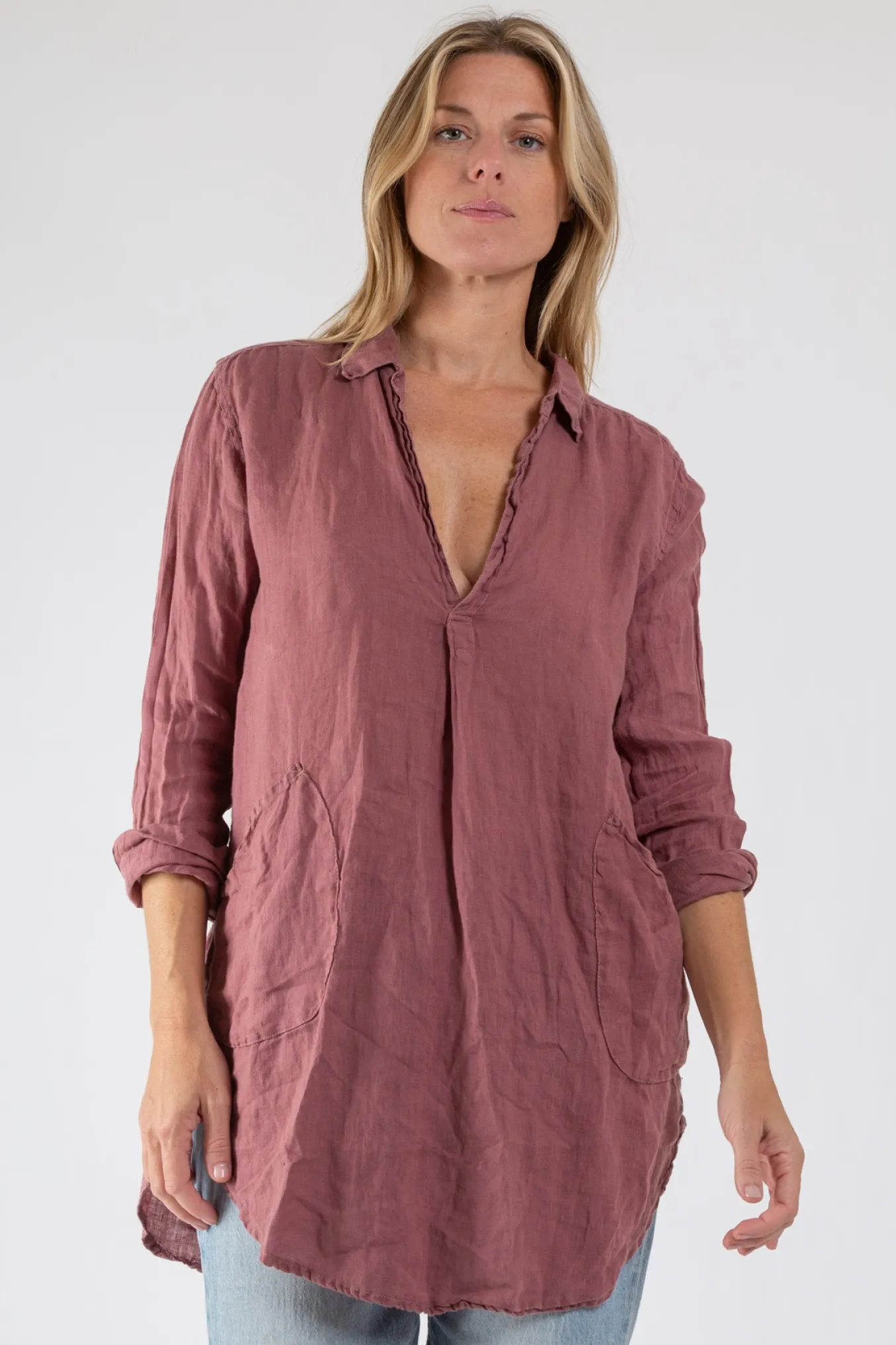 This Artist Smock Open Collared Tunic Has A V-Neck, Full Body Silhouette, A Gathered Back Panel, A Curved Hemline That Is Slightly Longer In The Back And Curved Patch Pockets In The Front. Cp Shades Gets Better With Age, An Investment In Your Wardrobe, Pair With Legging Or Jeans.