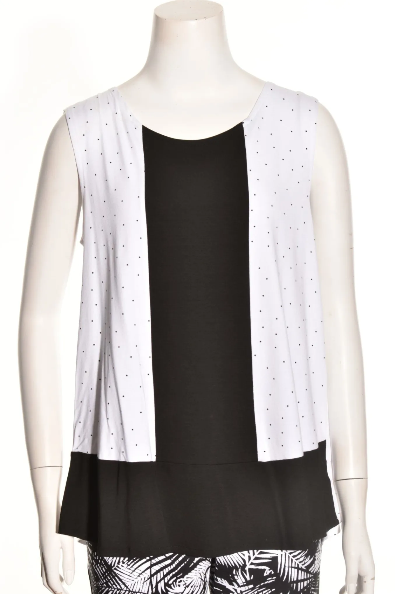 This Tank Effortlessly Wearable, An A-Line Silhouette, Swiss Dots All Over Complimented With A Color Block Of Black Down The Front Center And At The Front Hem.