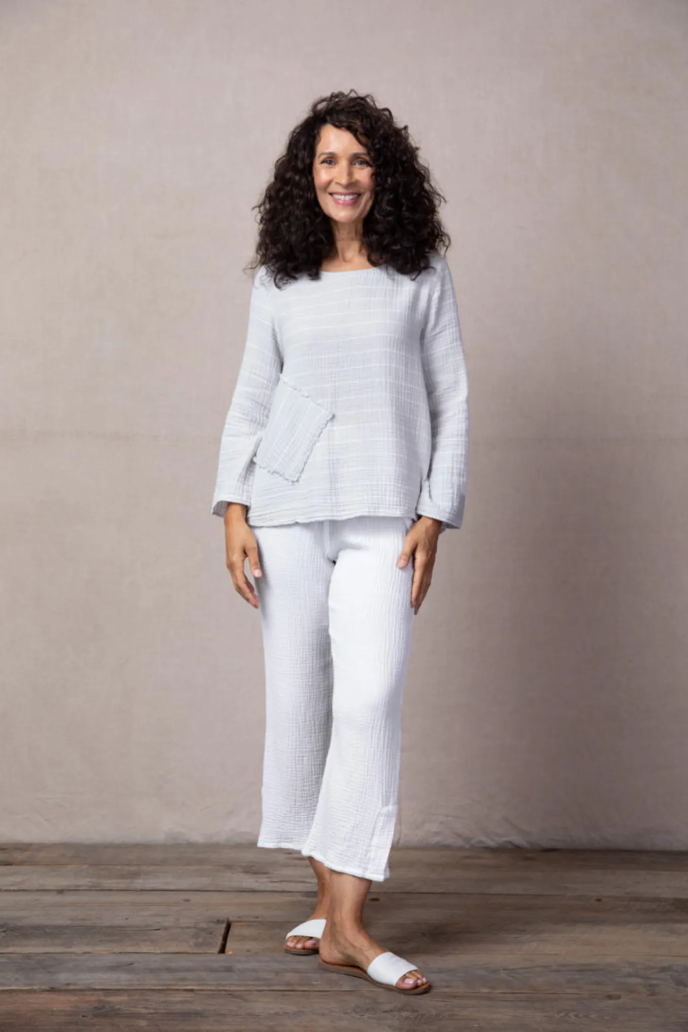 This Easy Pull-On Pant In Dove, 100% Cotton Double Cloth Has A Light Texture. The Fit Is Relaxed And Is Airy And Comfortable. The Hem Features A Kick Pleat Detail And This Pant Has Aide Seam Pockets. She Pairs Beautifully Back To The Seaside Pocket Pullover, Style, #75701 For A Casual Dressed Ensemble. Perfect For Dinner With Friends Or Summer’s Night Out.