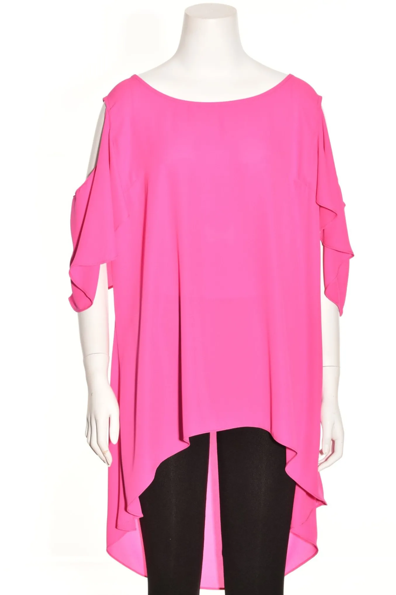 Calling All Vibrant Lovers Of Color! This High-Low Hem Tunic Features Cold-Shoulders, Scoop Neckline, Short Flowy Sleeves And A Shift Cut Which Hits Just Below Most Everyone’s Hip. This Gorgeous Top Available In Fuchia. This Top Has Great Movement And Flow In The Suvblime Georgette.