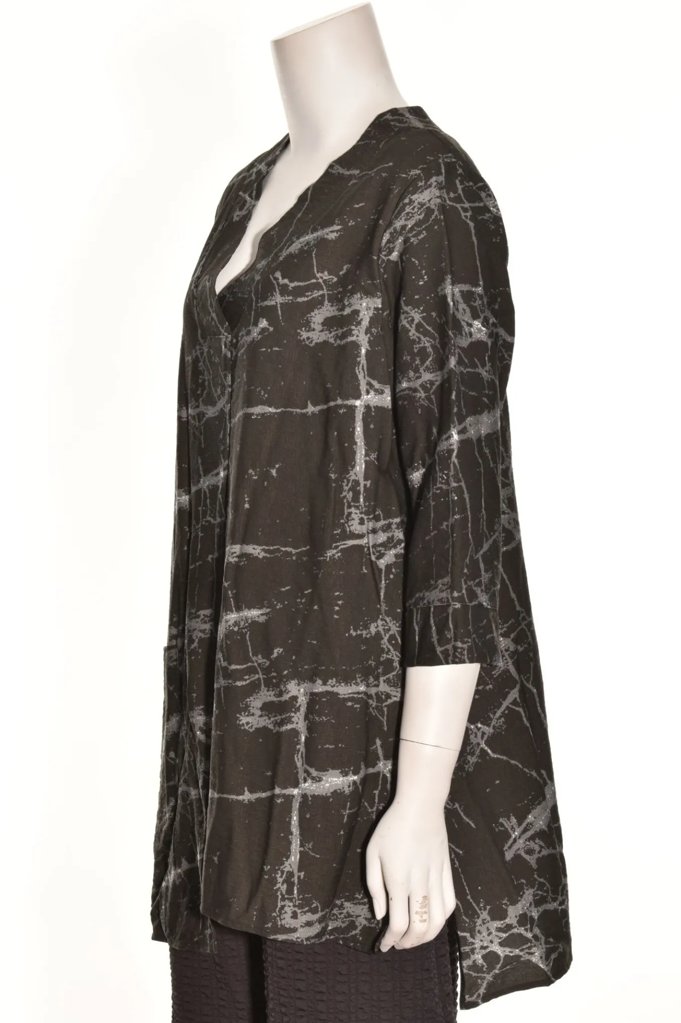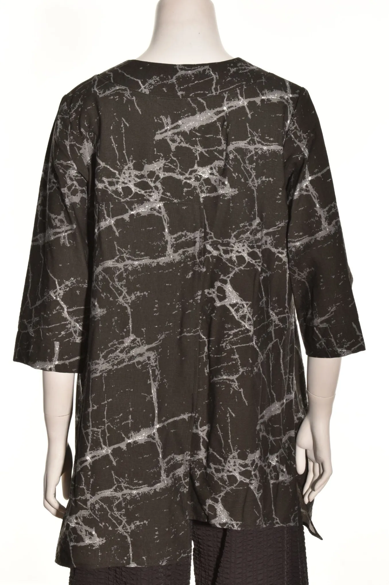 The Reef Has A Woven Rayon Crepe Has A Loose Yet Still Follows The Shape Of Your Body In A Figure-Flattering Way. Details A Banded V-Neckline And 3/4 Lebgth Sleeves Featuring A Generous Front Pocket And Slits At Both Sides And Center Of Front And Back. The Staggered Hemline Is Shortest On The Left Side. Made Up In A Sophisticated Marble Print Of Black And Grey With Just A Little White.