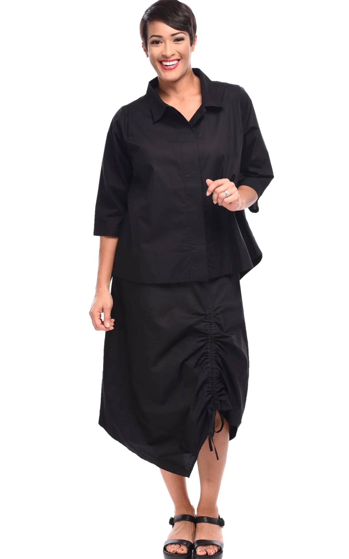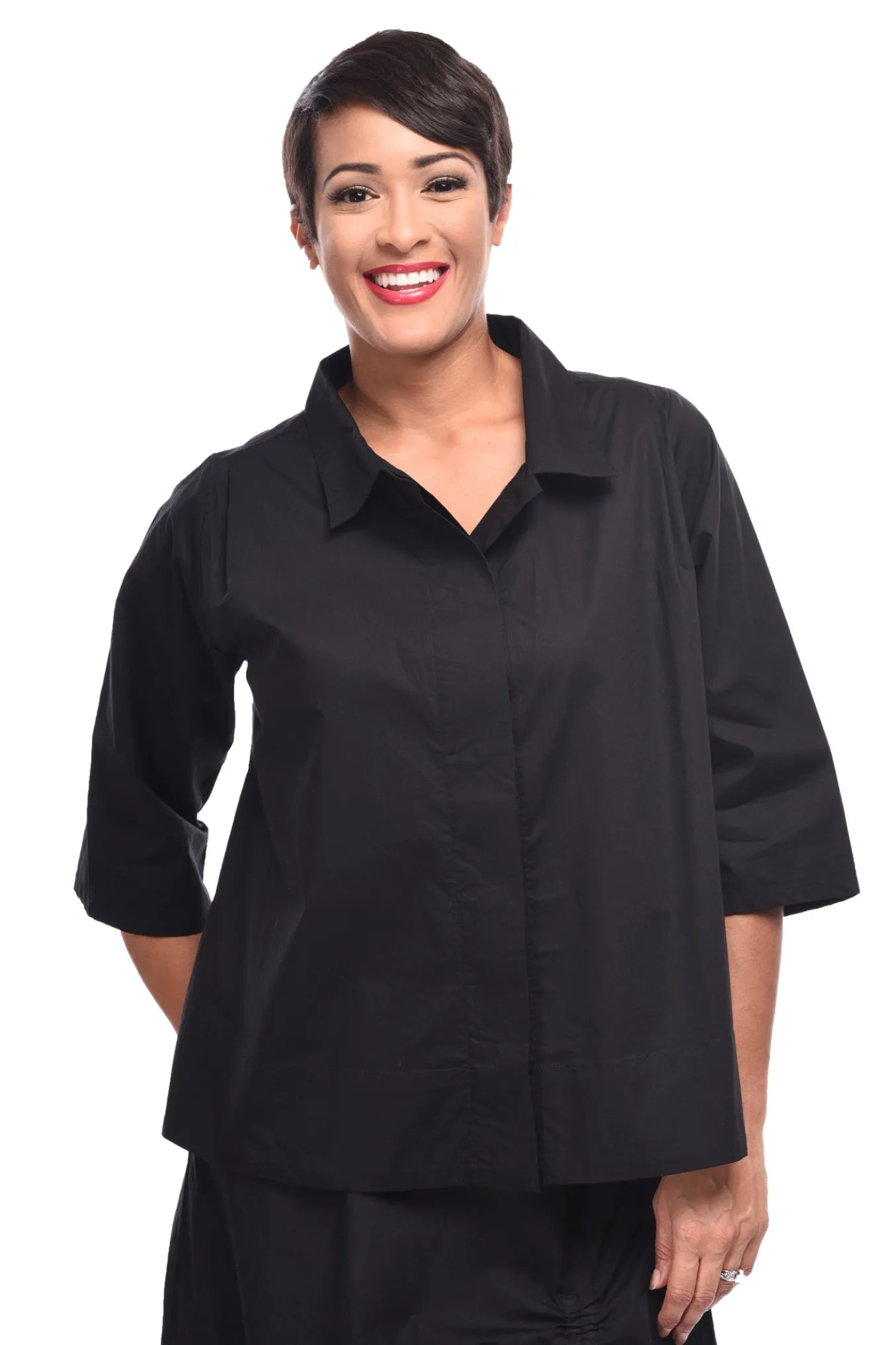 The “Alice Shirt”, A Loose Fitting Top With A Contemporary Vibe. This Crisp 100% Cotton Top Has A Hidden Button Placket And A Curved Hemline That Dips Slightly Lower In The Back. Details Include 3/4 Length Sleeves, A Center Pleat In The Back, And On Seam Side Pockets. In A Sophisticated Solid Black.