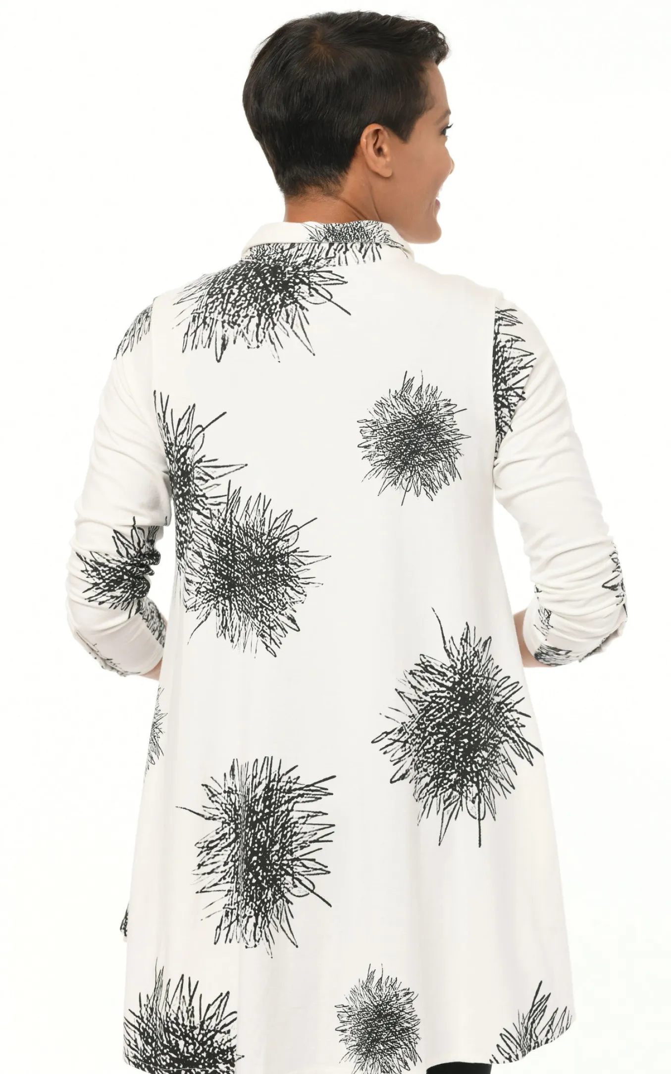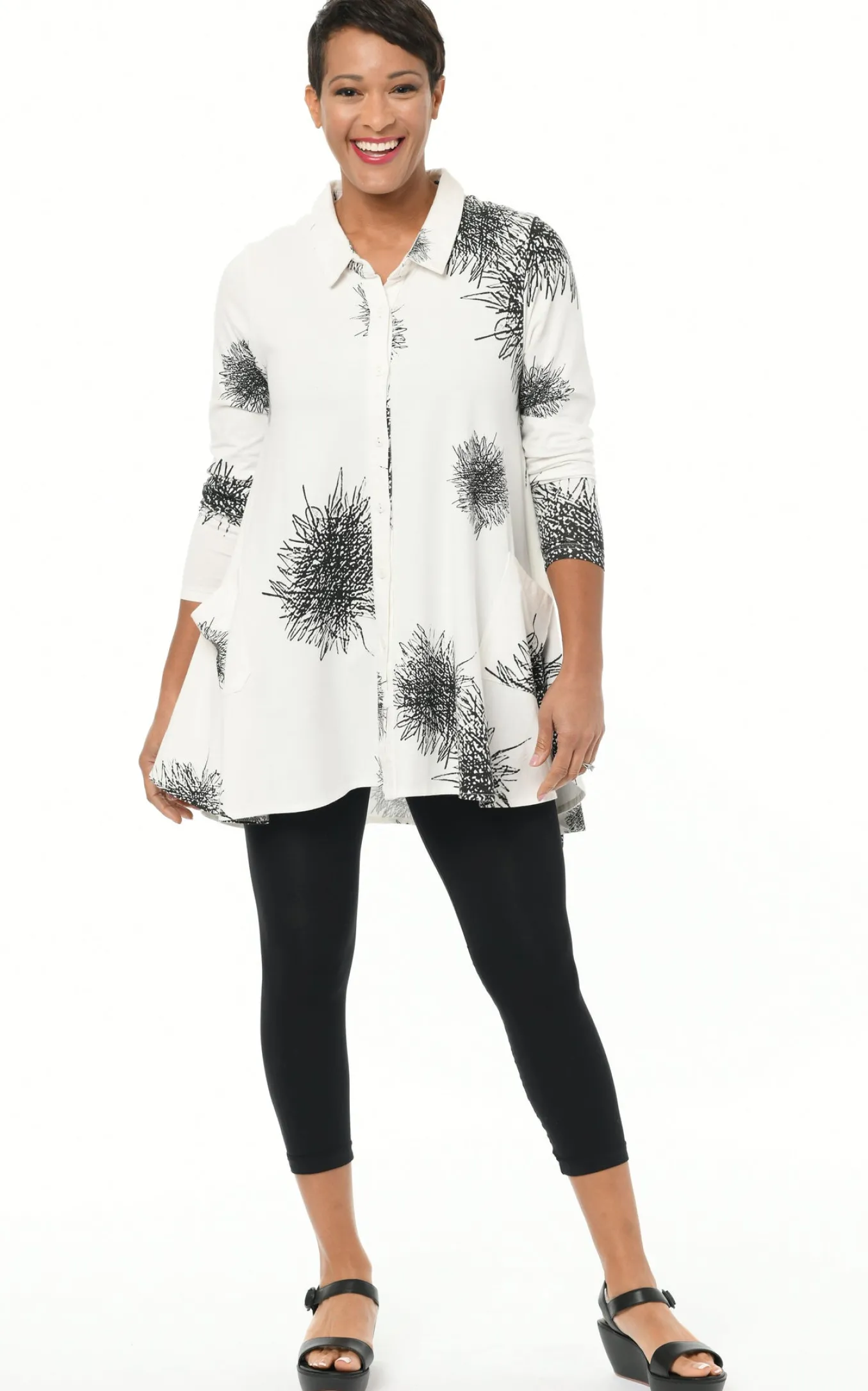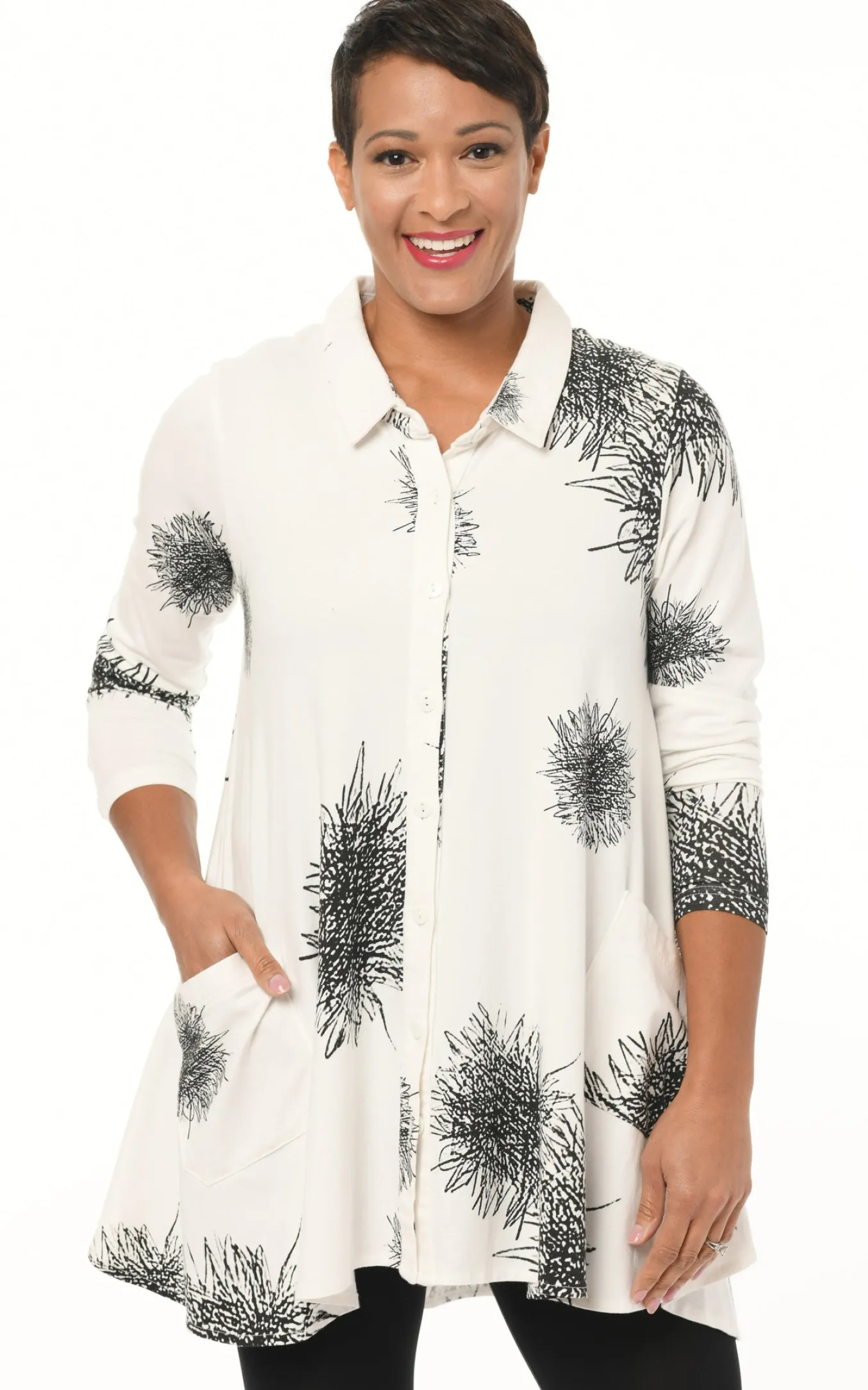 Another Super-Soft Luxurious Knit In Cotton Modal. This Longer Length Full Button Front Tunic Is A Fit And Flare Silhouette. This Figure Flattering Top Has An Artsy Look Made Up In Shabori Tie Dye, In A Print Of Black/White. . Other Details Include A Pointed Collar, Side Pockets And Full Lengthsleeves With A Trio Of Buttons At The Cuff. Angled Front Patch Pockets Are The Bonus. Pair This Tunic With You Favorite Leggings, Wear It With Palazzos, Open It As A Jacket. One Of Lea’s Personal Favorites In The Snapdragon Collection.