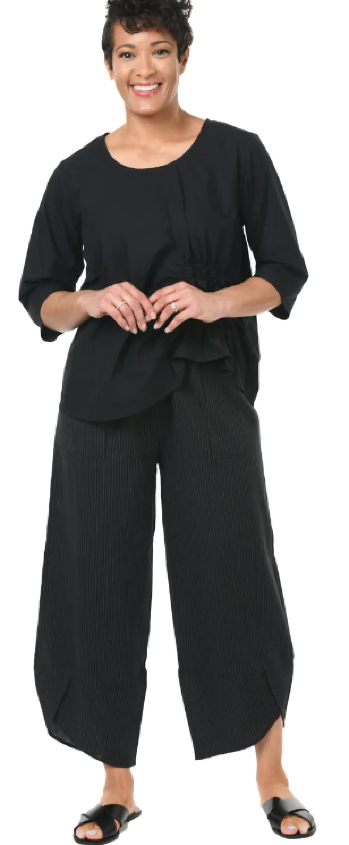 Light And Airy, This Comfortable Lightweight Pant Has A Full Elastic Pull-On Waist With Curve Edged Side Pockets. The Full Pant Tapers In At The Ankle With A Tulip Shape. The Hemline Is Slanted With An Overlapping Slit Adding More Detail To This Fun Pant In Manchester Stripe Design.