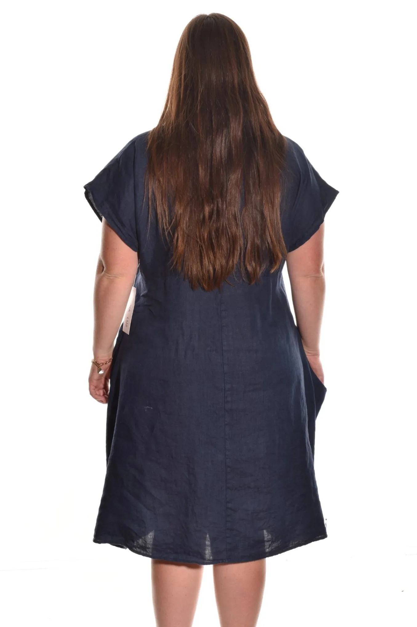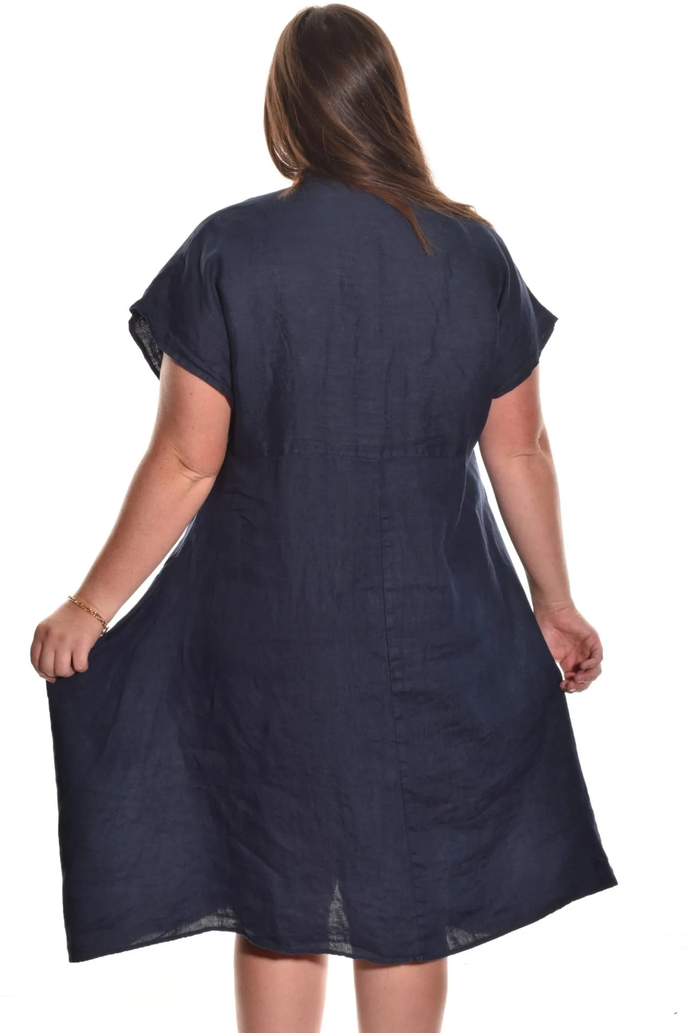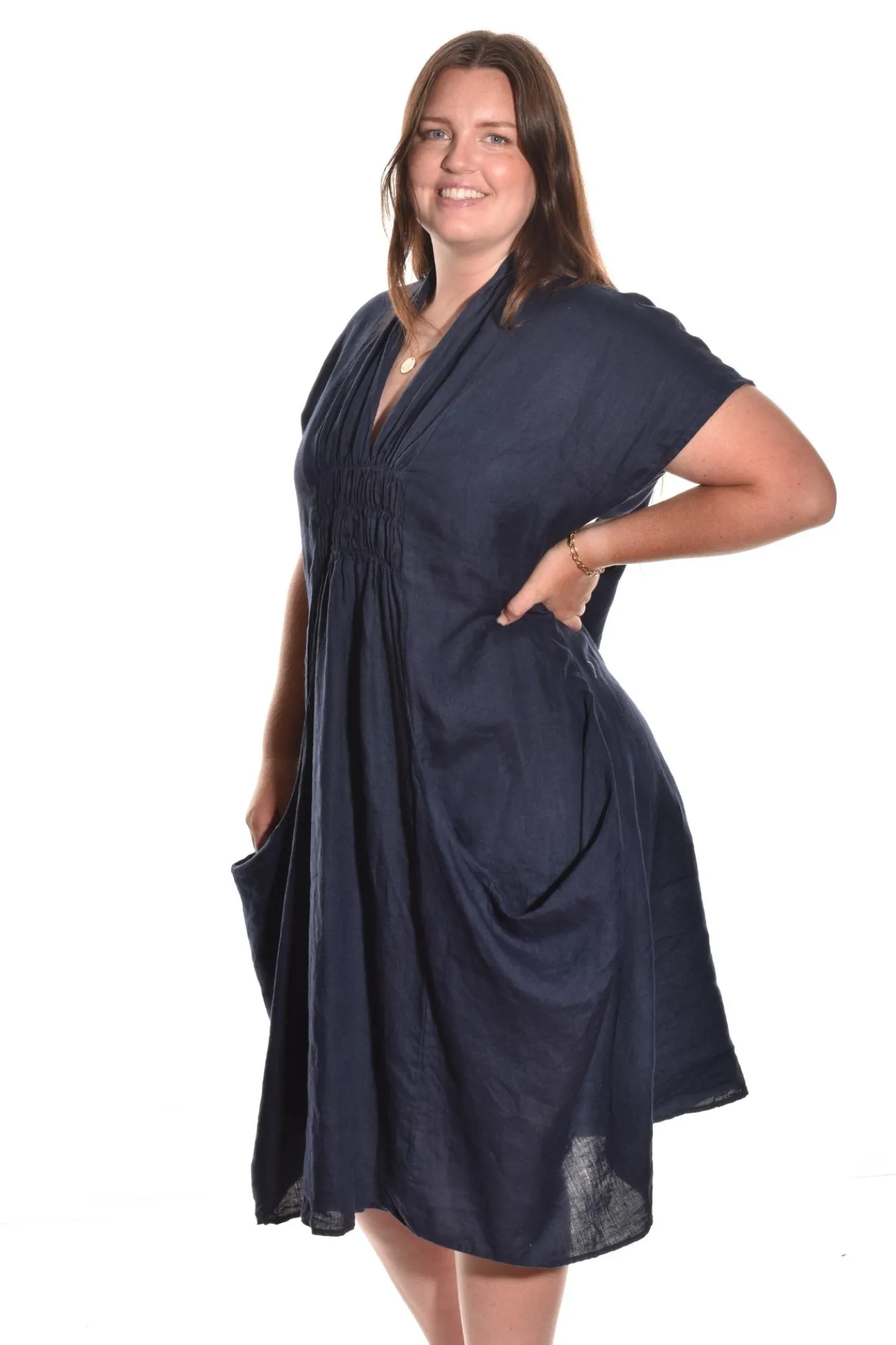 The Shawl Collar Dress By Luna Luz Is A Longtime Member Of Their Linen Collection. This Easy Fit Dress Is A Great Choice For Warmer Weather. Figure Flattering, She’s Generous In Cut With A Loose Fit, Elastic Gathers At The Bodice, Kimono Sleeves That Offer Ample Coverage And A Hem That Hits Just Above The Knee. A Shawl Colloar, V-Neckline And Two Pouch Pockets Add Practical Style.